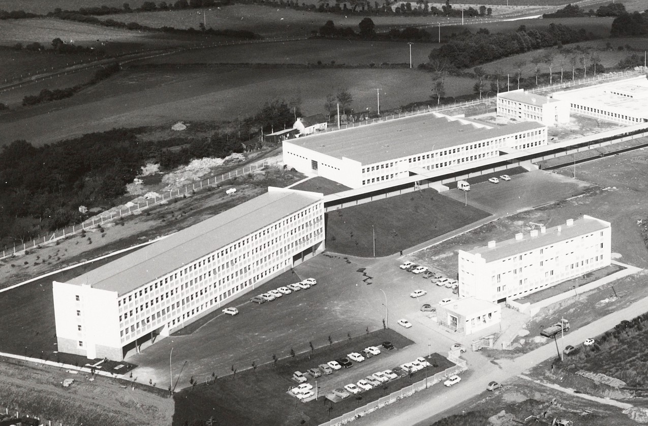 L'internat et les ateliers. Au premier plan, l'administration. A l'arrière plan, l'ancienne infirmerie (détail d'une vue aérienne Heurtier du 9 octobre 1967, prise du sud).Immatriculation