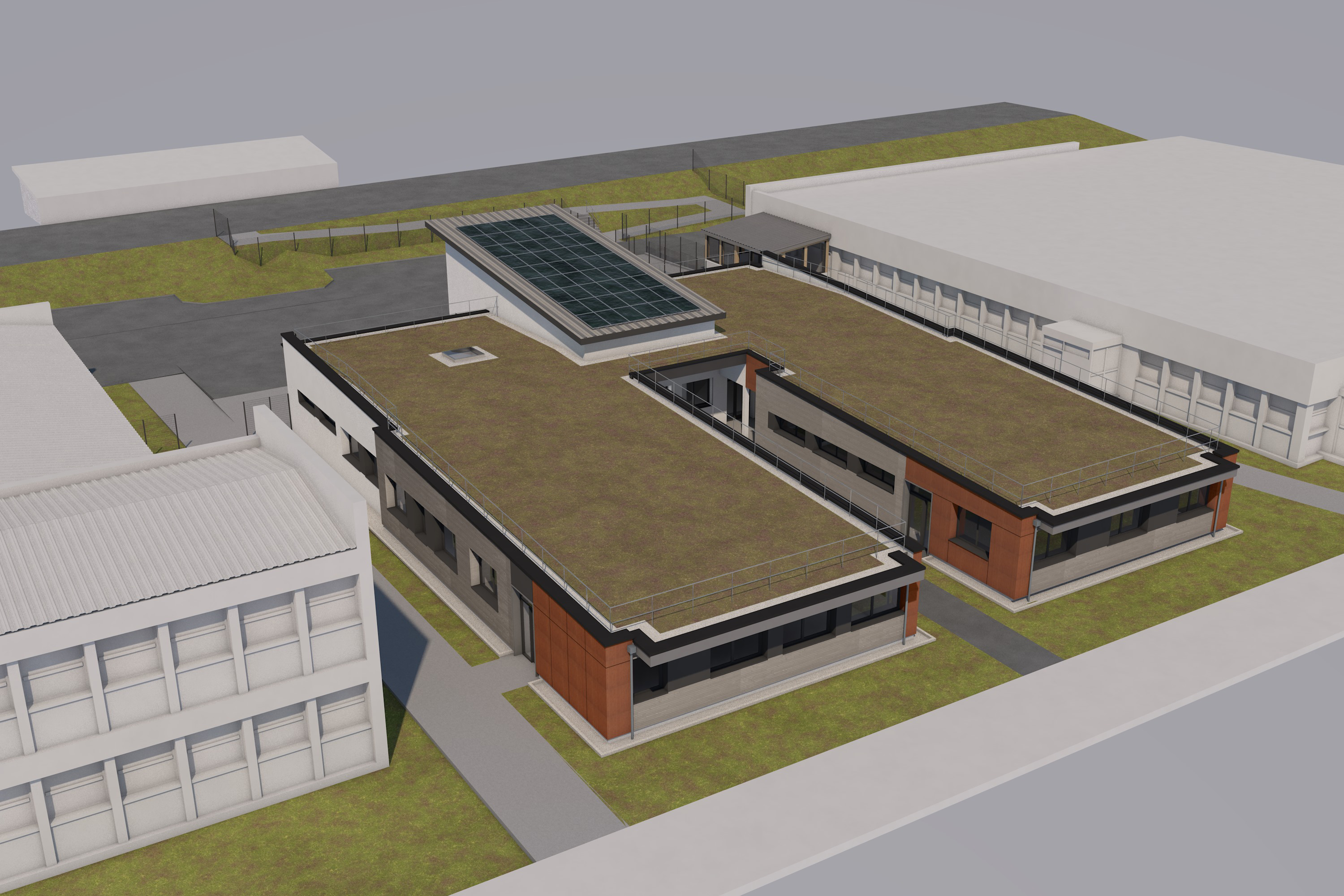 Dessin d'architectes : nouvelle infirmerie et locaux agents, vue 3D (Atelier Trois-Architectes, 2022). NB : la galerie couverte n'a pas été intégrée sur cette vue.Immatriculation