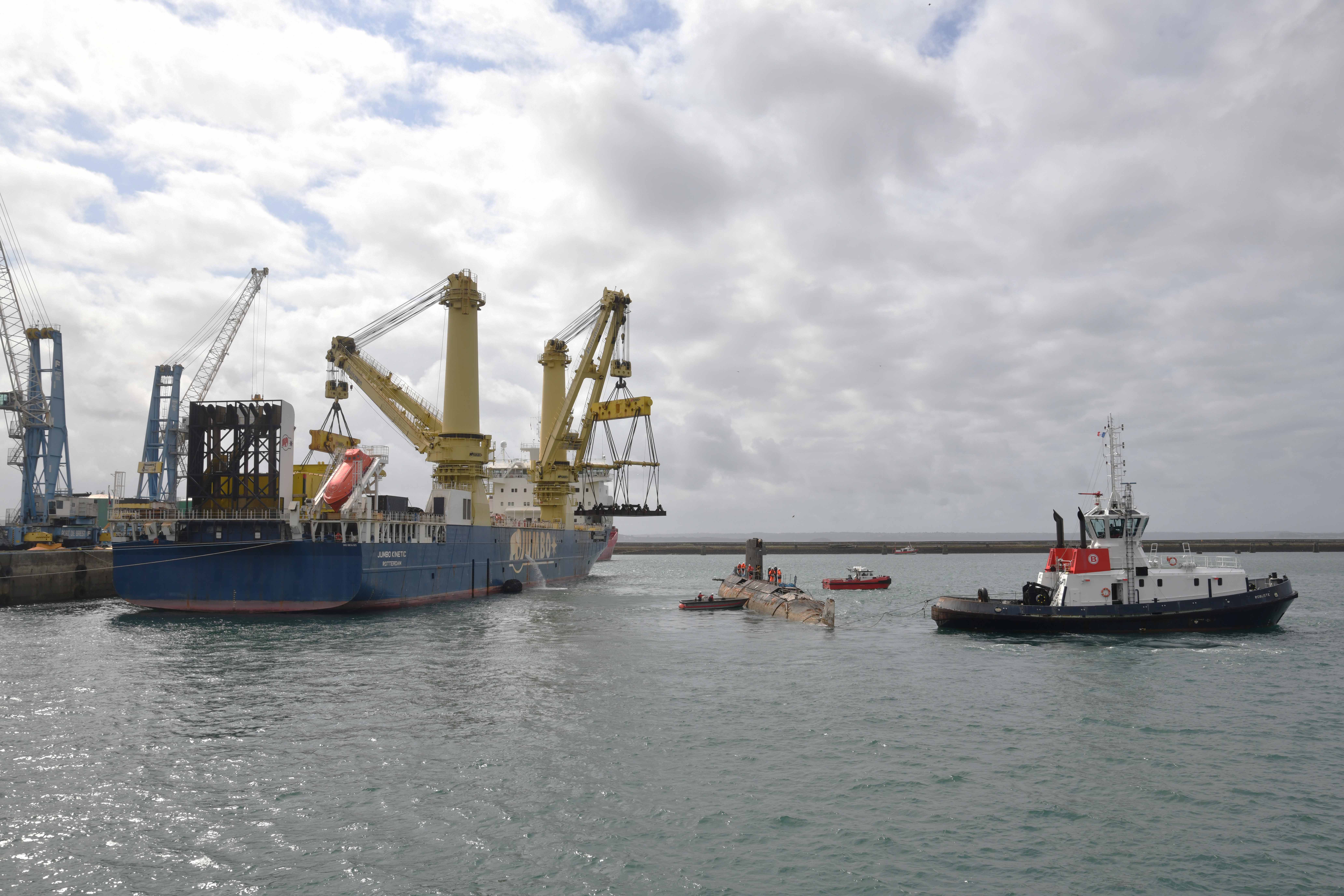 Déchargement de la coque de l’Agosta depuis le pont du Jumbo Kinetic au port de Brest, 5 août 2021Immatriculation
