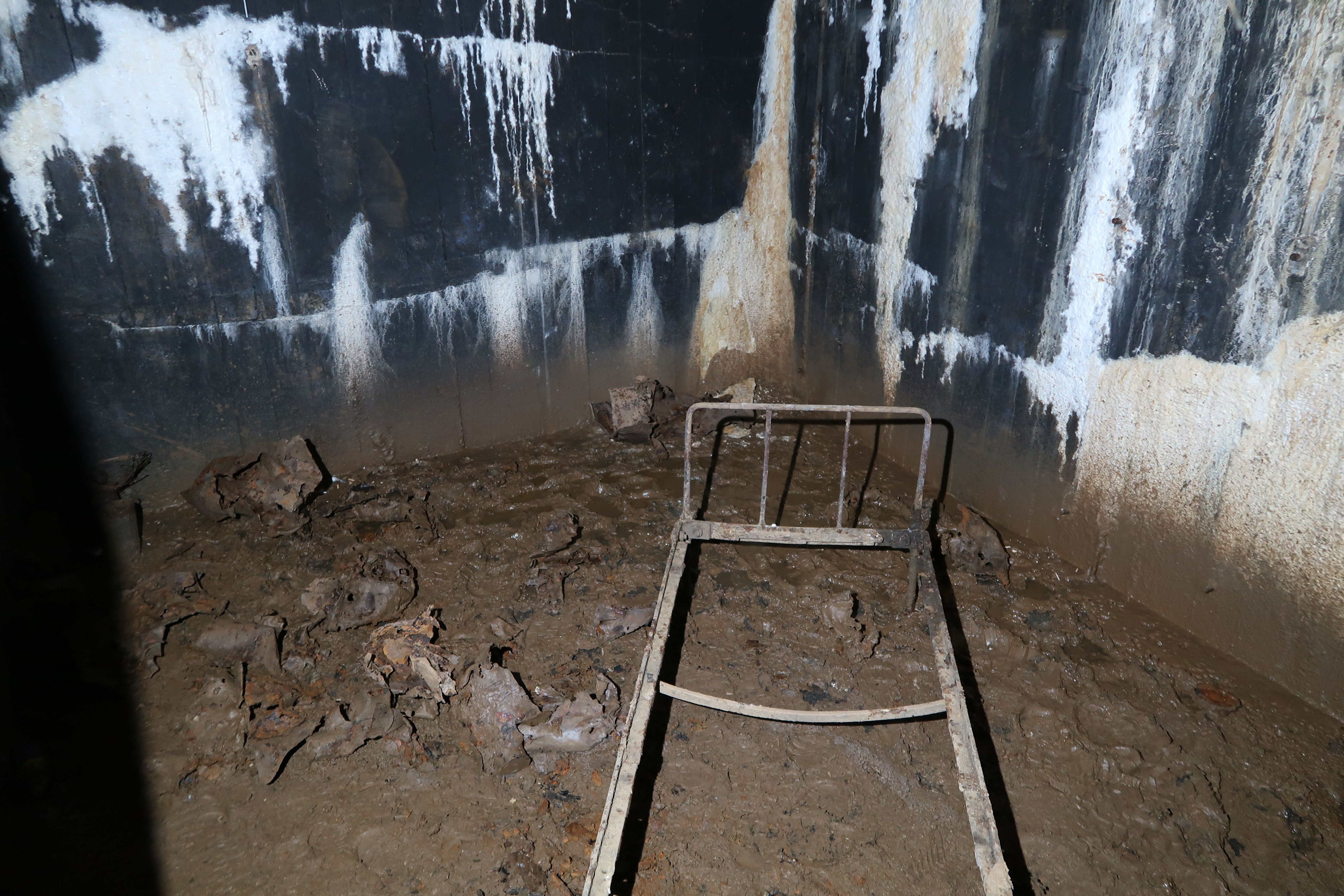 Vue de la pièce de vie - chambre de troupe : lit (état au 11 octobre 2022). Au sol, débris métalliques provenant de caisses métalliques d'obusImmatriculation