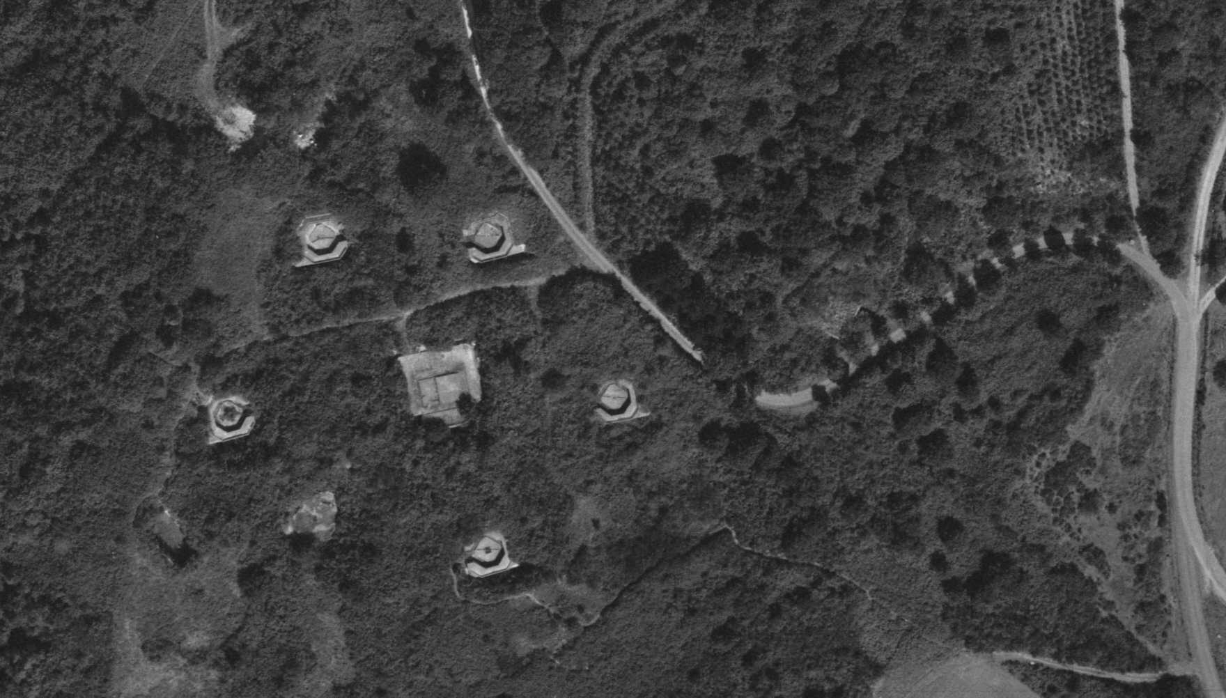 Vue aérienne verticale, 1964. Au centre de l'hexagone formé par les bunkers - encuvements, le bunker - poste de direction de tirImmatriculation