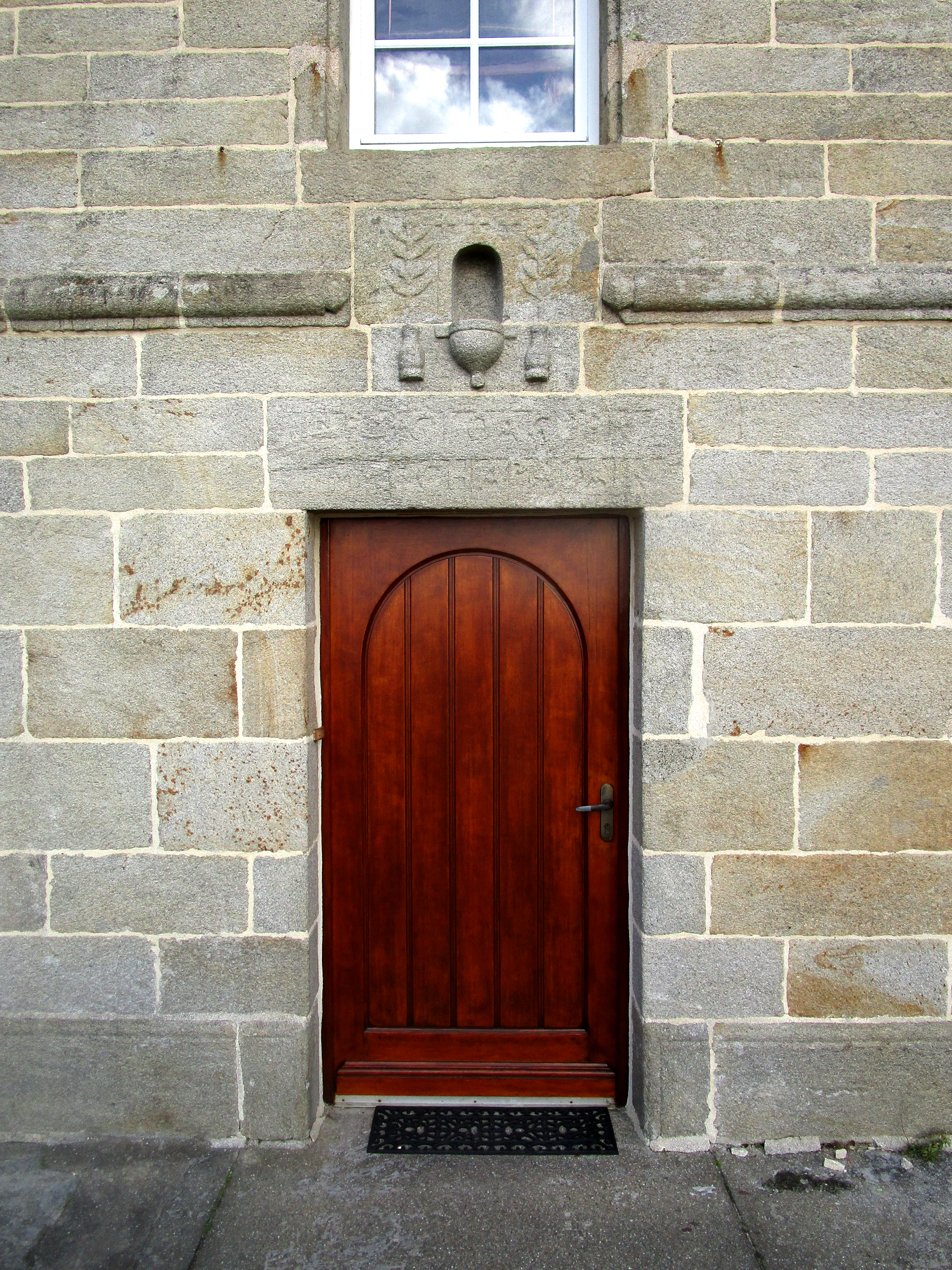 Kerhas Bras, ferme 1, détail de la porte d'entrée avec niche à saint et inscriptions : ? GLOAGUEN / ? CHAPALAIN.Immatriculation