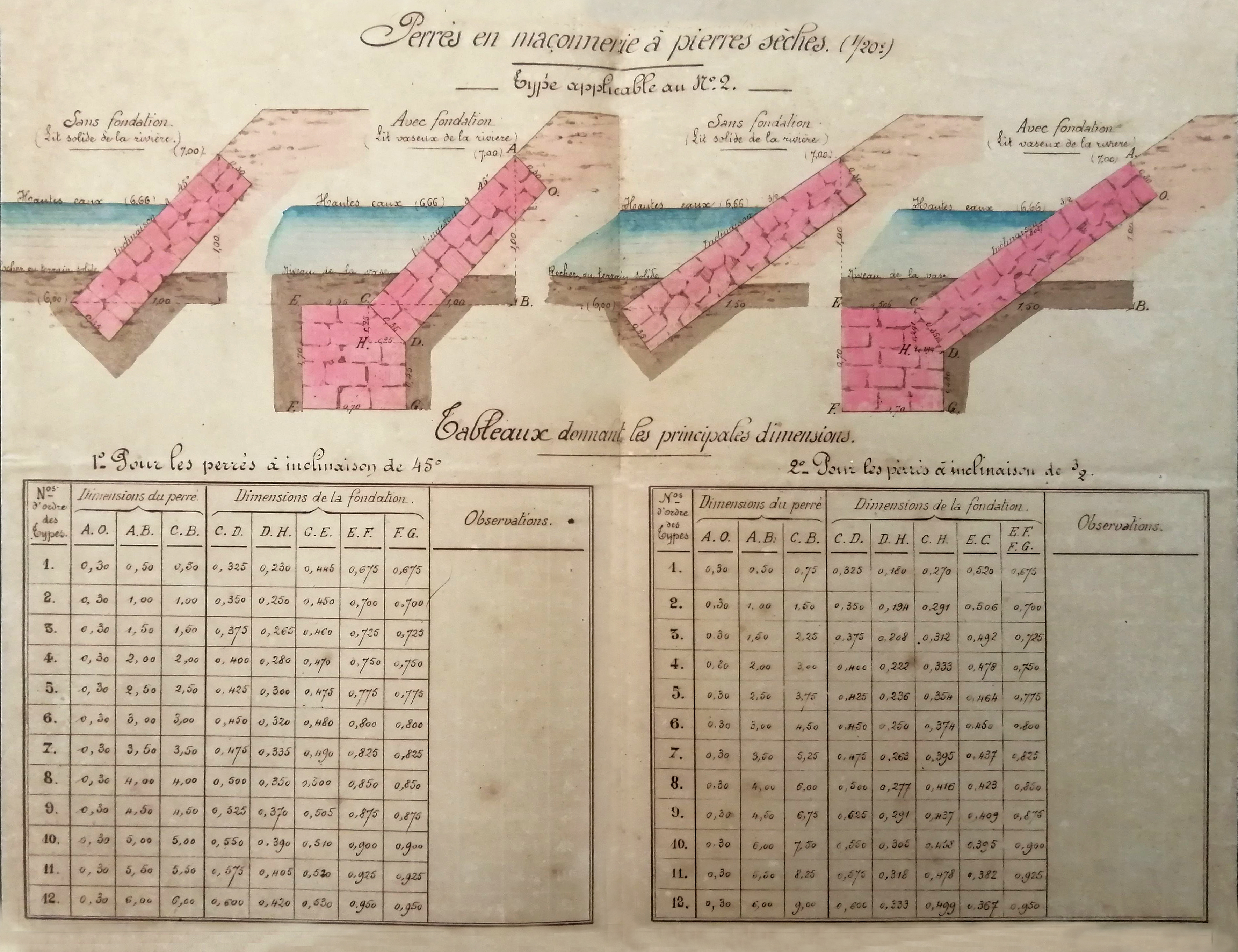 Dessin des perrés au 1/120e et tableaux donnant les principales dimensions. Reproduction du projet d'exécution, 1892.Immatriculation