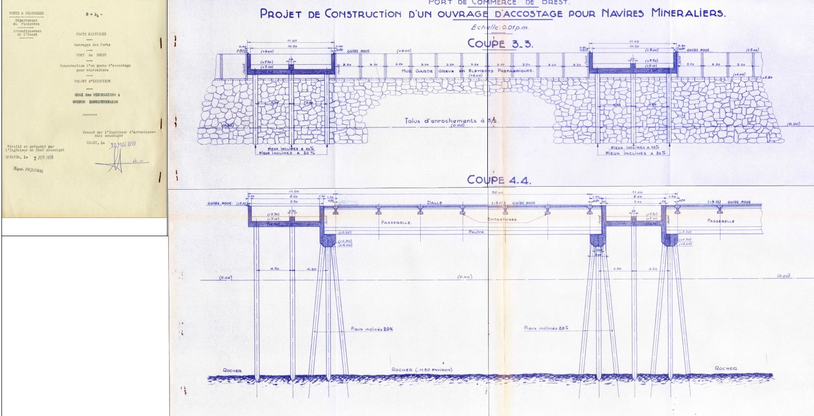 Coupe du quai Minéralier dressée par l'ingénieur Piquemal, mai 1959 (Ponts-et-Chaussées, département du Finistère, projet d'un ouvrage d'accostage pour navires minéraliers)Immatriculation