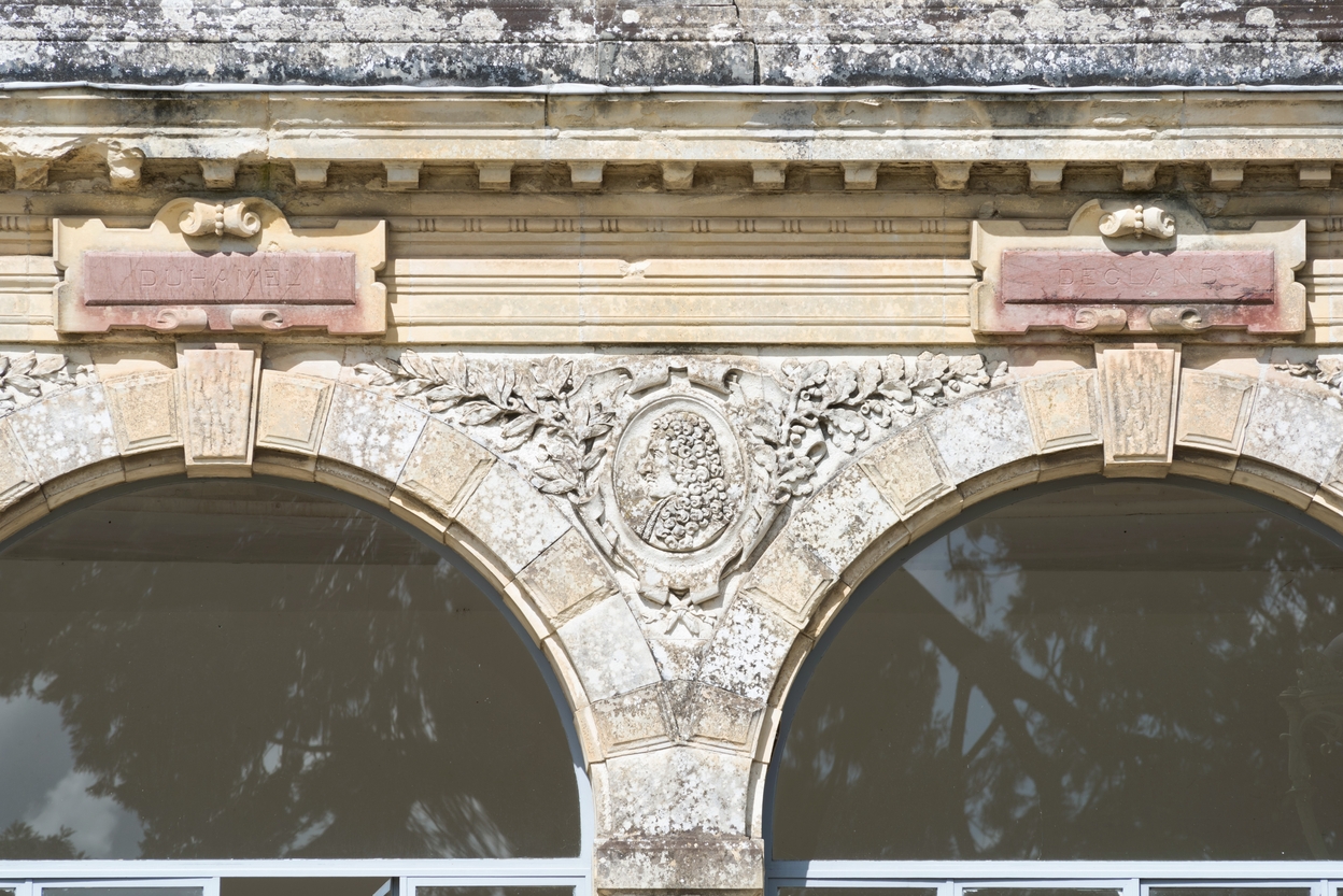 Orangerie est, détail des rembardes de toiture ; sur la façade, l'effigie d'une gloire de l'horticulture : Le NôtreImmatriculation