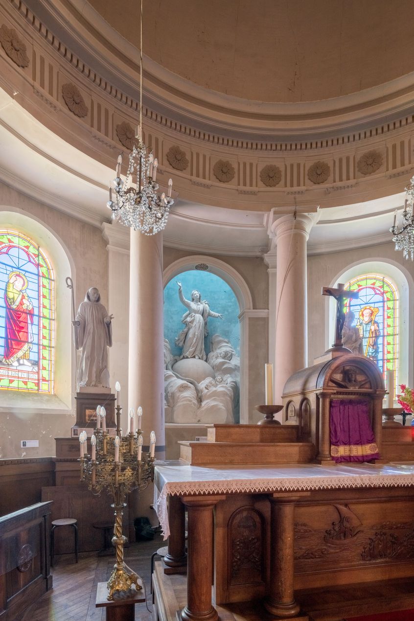 Le choeur, vue d'ensemble de l'hémicycle valorisant le groupe sculpté à jour célesteImmatriculation