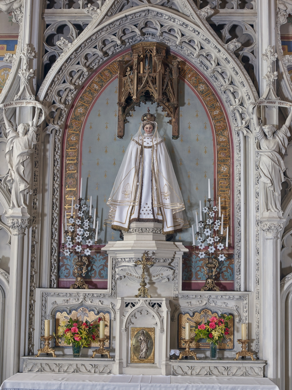 Vue de la statue miraculeuse dans le décor néogothique de la chapelle de pèlerinage.Immatriculation