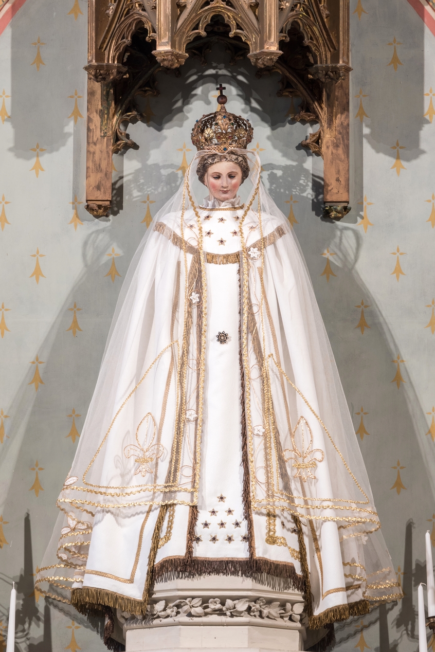 Présentée dans un décor néogothique constitué d'un socle, d'un dais mais aussi d'un retable monumental.Immatriculation