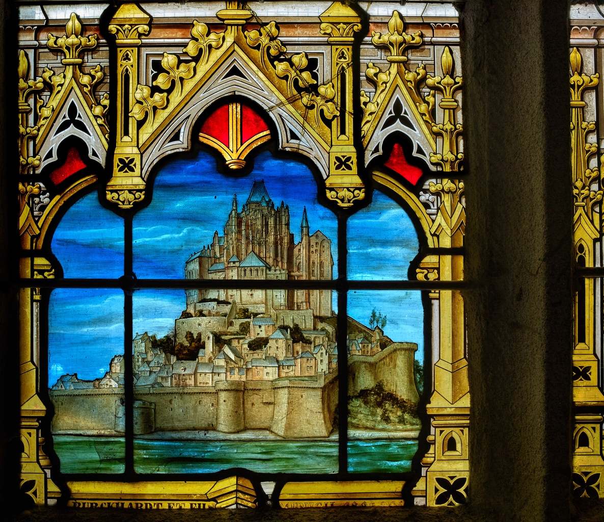 Verrière de la baie 16 : Saint Michel et le dragon, basilique Notre-Dame-du-Roncier (Josselin),