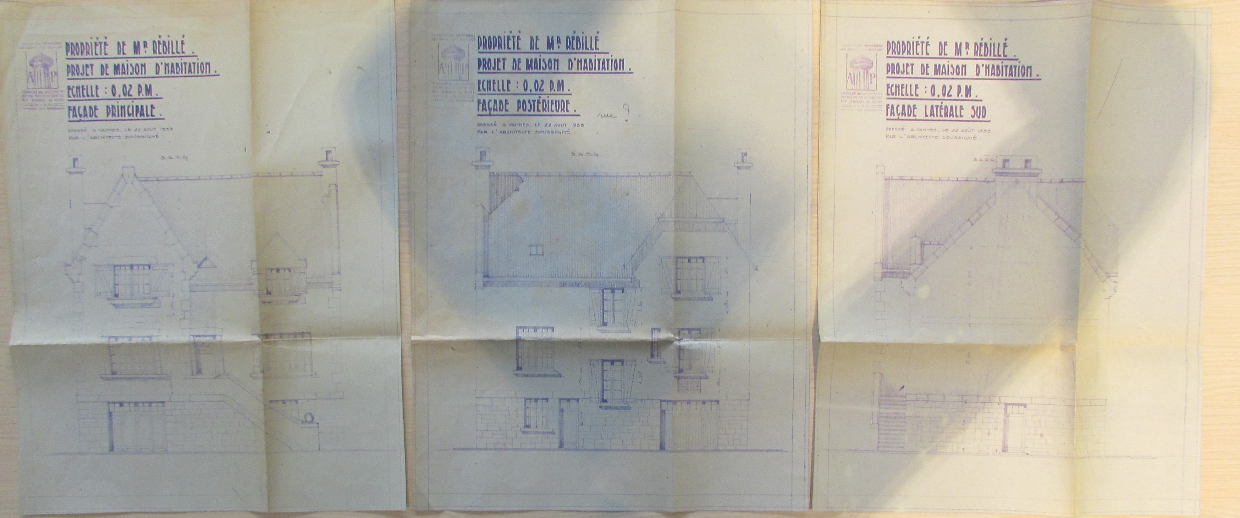 Projet de la maison Rébillé, façades et coupe, 22 août 1939 par Guy Caubert de Cléry. AM Vannes 5 J 391.Immatriculation