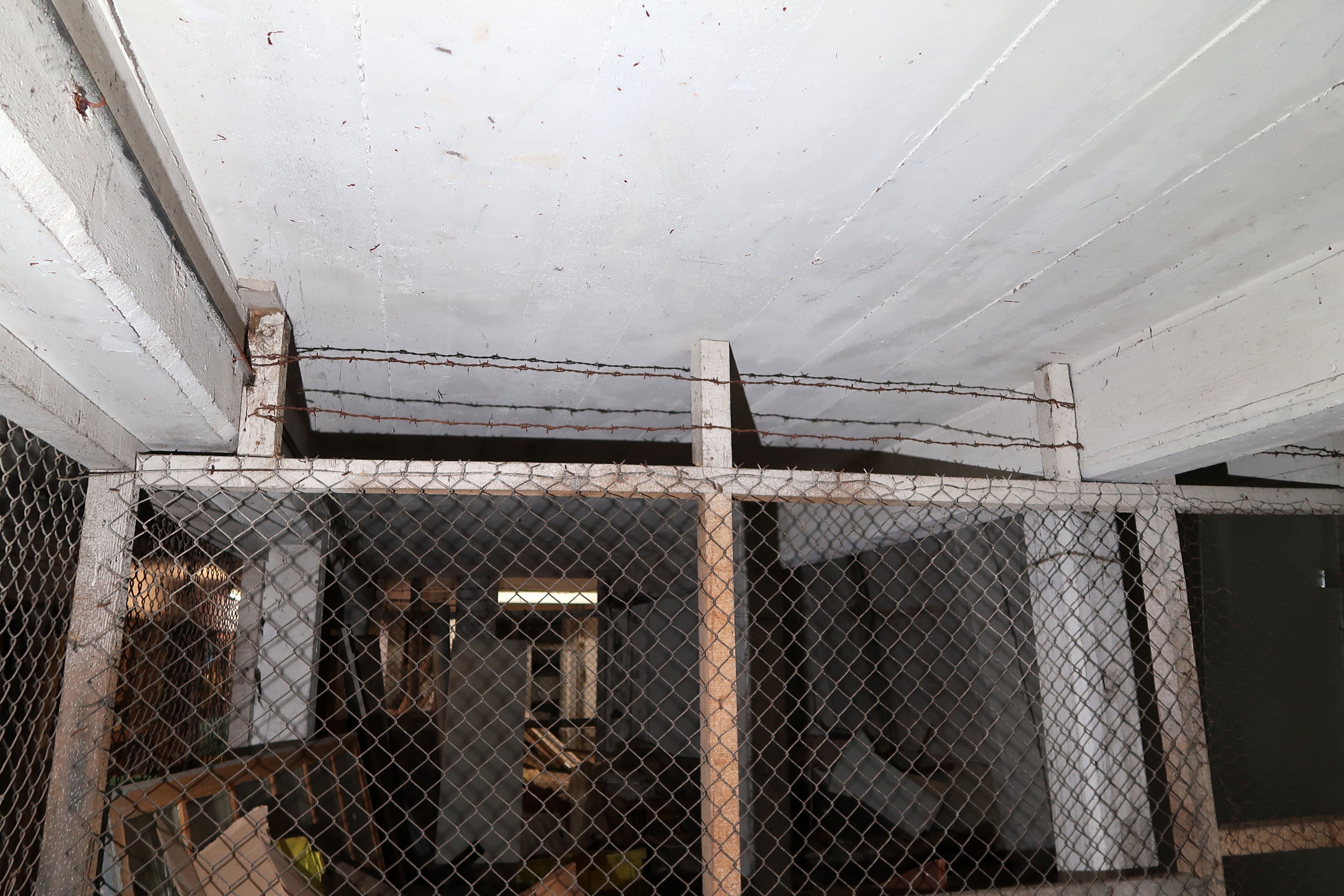 Premier étage : grillage surmonté de deux rangs de fil barbelé séparant deux boxesImmatriculation