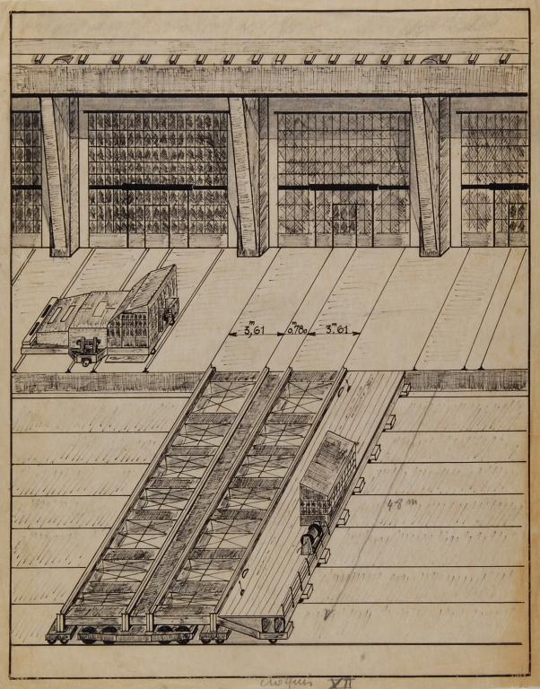 Dessin du chariot de translation avec ses quatre rails spéciaux et du tracteur-pousseur, croquis XII (Service Historique de la Défense de Lorient, Monographie de la base "Ingénieur Général Stosskopf", 1945-1946)Immatriculation
