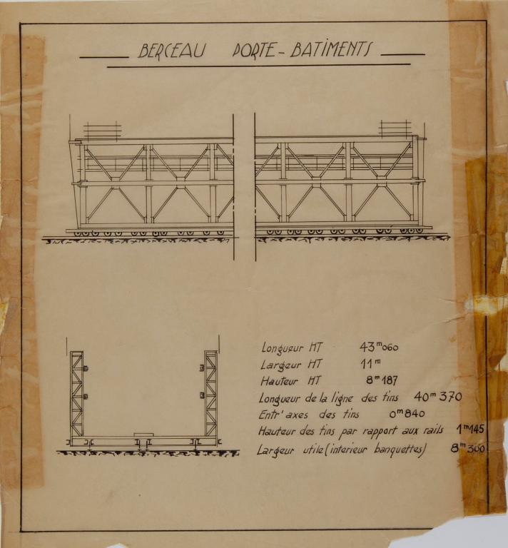 Elévations et coupe du "berceau porte-bâtiments" du bunker "KI", croquis X (Service Historique de la Défense de Lorient, Monographie de la base "Ingénieur Général Stosskopf", 1945-1946)Immatriculation