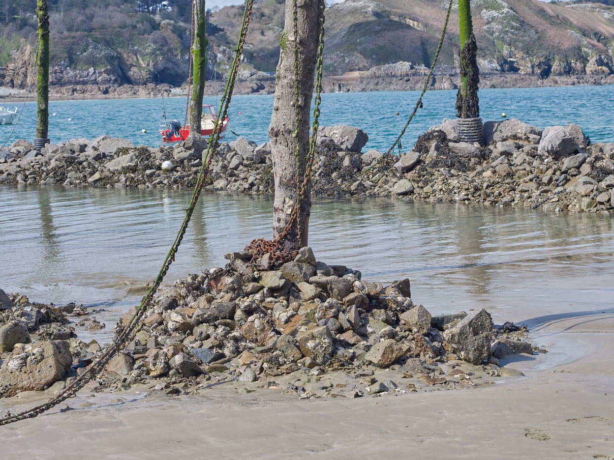 Détail des enrochements au pied des troncs d'arbre formant mouillage.Immatriculation
