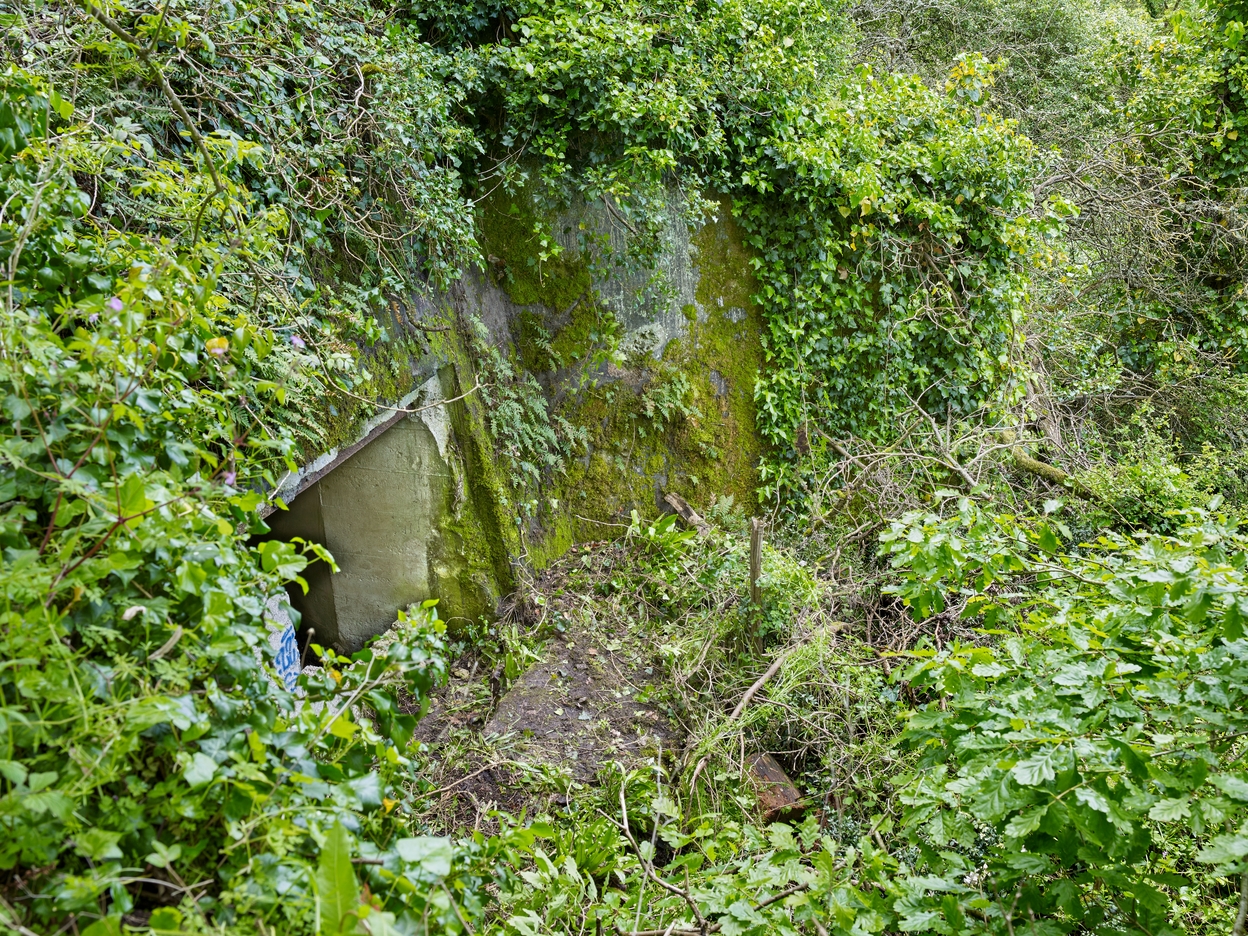 Vue de l'embrasure et du mur de flanquement Ouest (le bunker est doté de deux murs de flanquement à l'Est et à l'Ouest)Immatriculation
