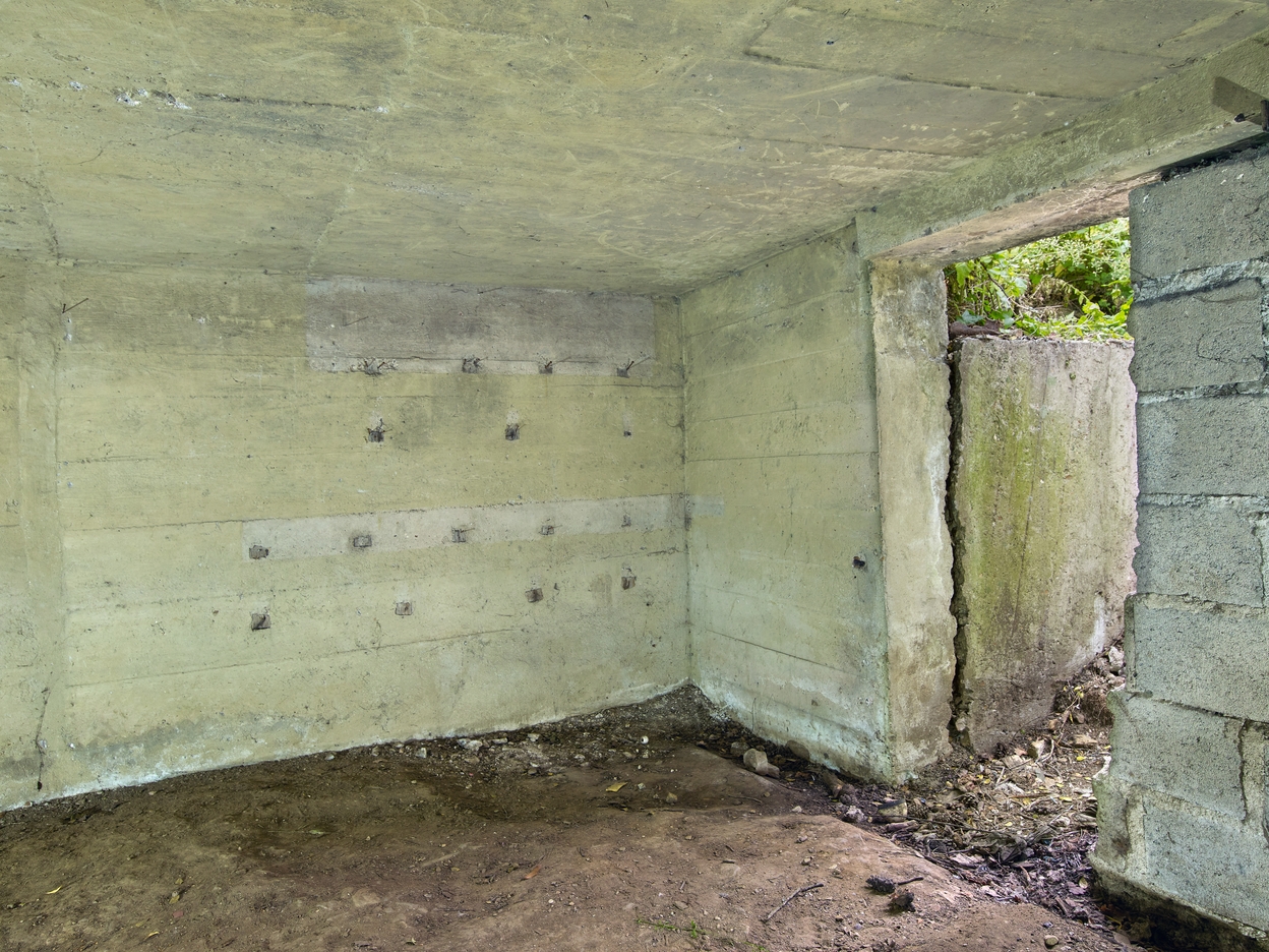 Vue de l'entrée (partiellement murée par des parpaings) de la chambre de tir. Le sol du bunker a été remblayé... Sur le mur sont visibles les traces de fixation d'une étagère murale (pour les coups de réserve ?)Immatriculation