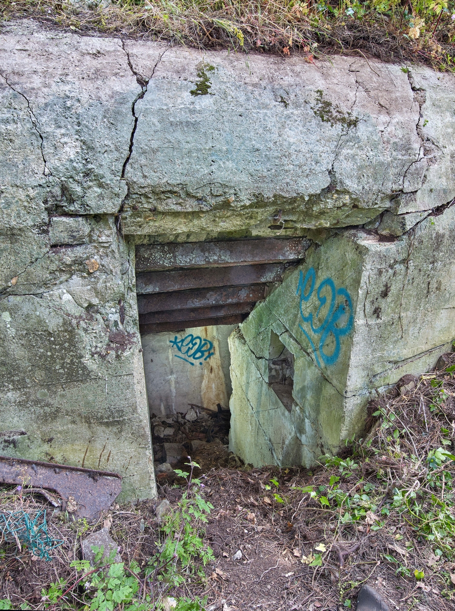 Vue du bunker - abri de type 502 situé à l'extrémité Est de la pointe : entrée Sud (ce type de bunker est dotée de deux entrées ; la seconde est murée). L'entrée Sud du bunker est partiellement murée par des parpaings (en partie basse). La tranchée d'accès est remblayée par des déchetsImmatriculation