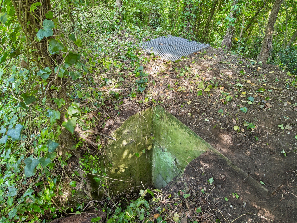 Vue du bunker - poste d'observation et de tir de type 58c dit Tobruk-Stand implanté au Sud près du bunker - casemate de type 680. Son entrée est murée par des parpaings. Une grille protège le poste d'observation et de tir circulaire des risques de chuteImmatriculation