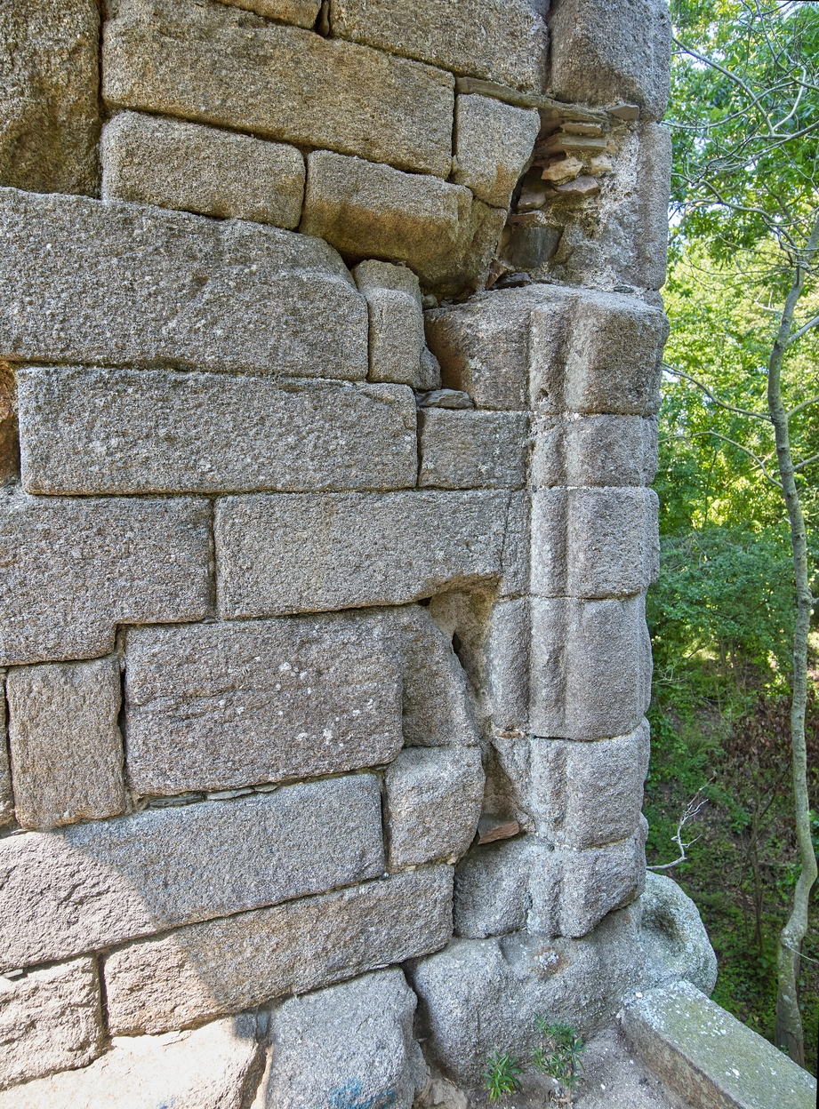 Vue du passage d'entrée du pont-levis : détail du piédroit mouluré avec dans le mur, les vestiges de différents dispositifs de fermeture. On voit le départ de la porte et en bas, la pierre accueillant l'un des deux tourillons du pontImmatriculation