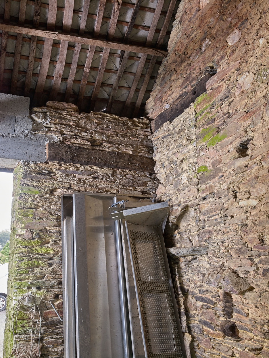 Logis 1706. Pignon nord du logis et dépendance transformée en remise. Porte de communication bouchée entre la chambre de l'étage et la dépendanceImmatriculation