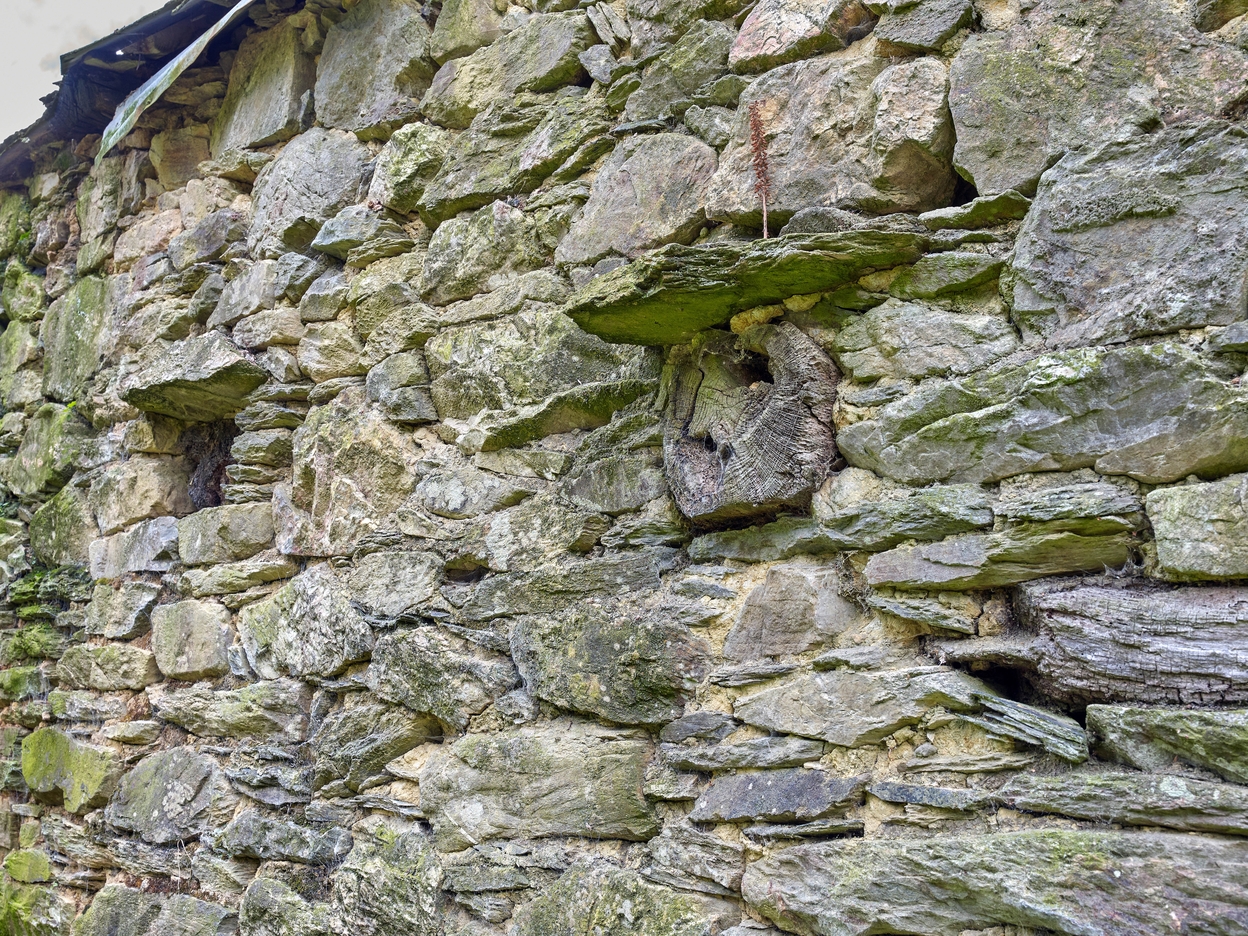 Logis-étable fin 18e ou début 19e siècle. Elévation sud-est. Détail des larmiers en schiste qui protégent les abouts des poutresImmatriculation