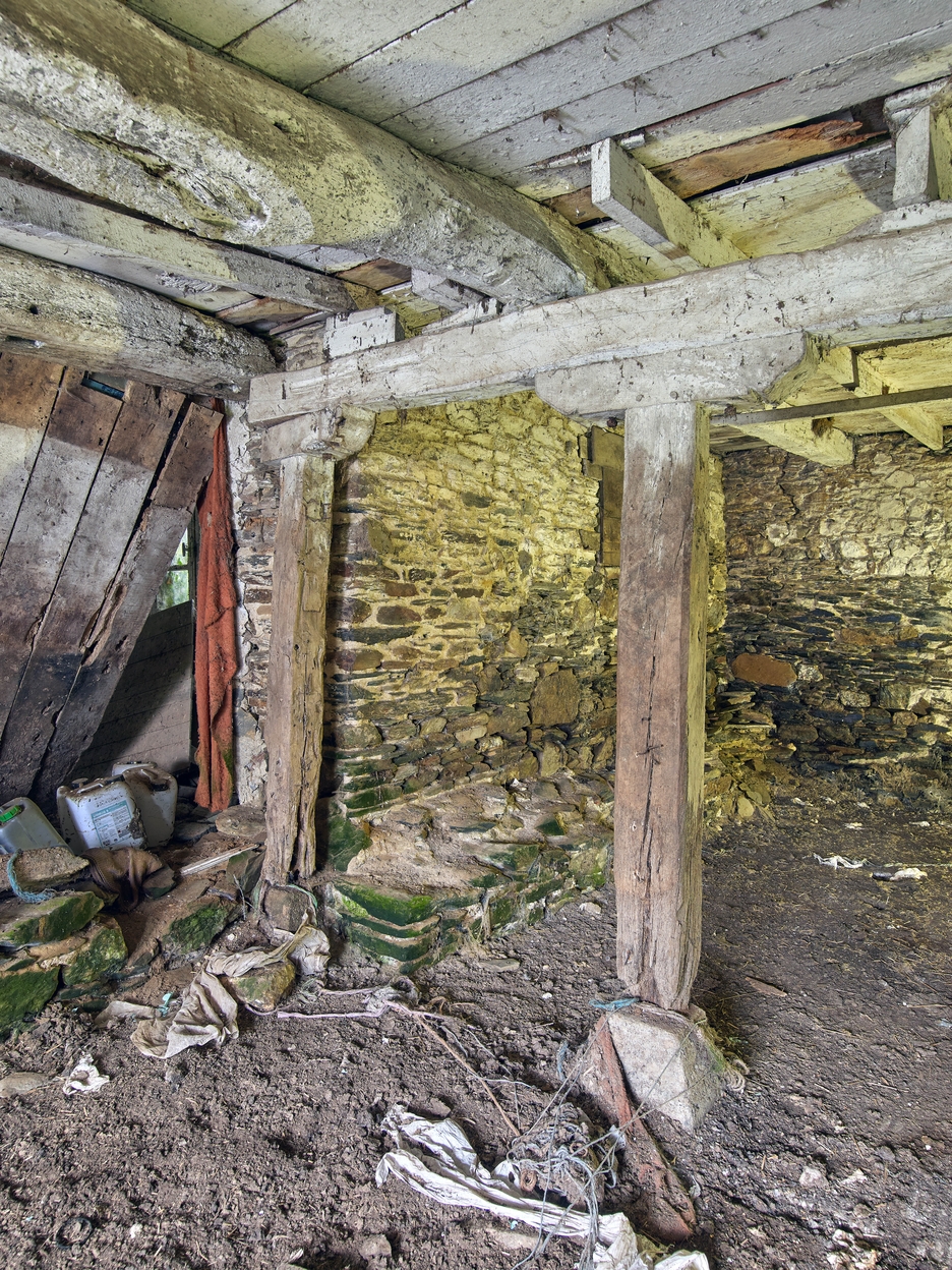 Logis début 17e siècle. Partie dévolue au conditionnement des toiles. Détail de la poutre transversale soutenue par des poteauxImmatriculation
