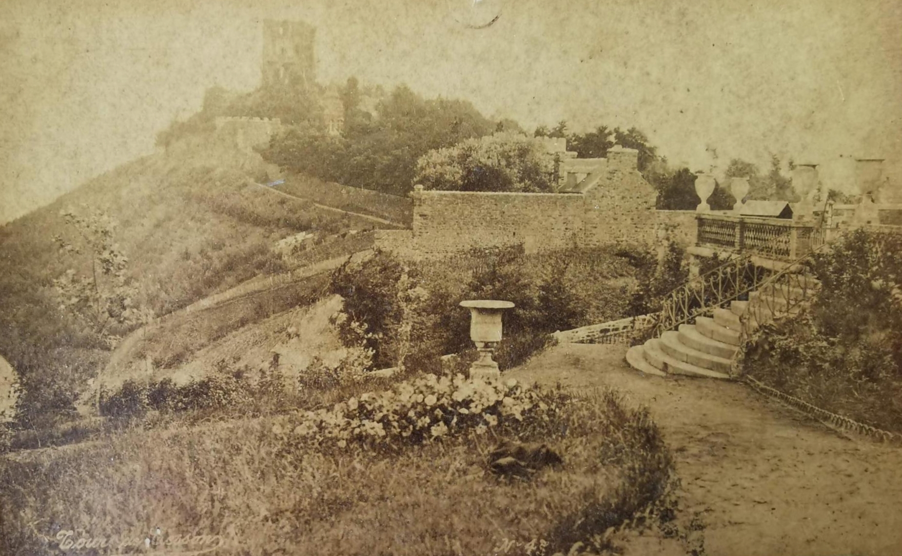 Vue générale du Domaine de la Tour de Cesson, vers 1885 (collection : Geslin de Bourgogne par Frédéric Thomas). La photographie porte l'inscription : Tour de Cesson, n° 4. On distingue les jardins, terrasses, conciergerie, belvédère (la Tour Malakoff) et en arrière-plan, la tourImmatriculation