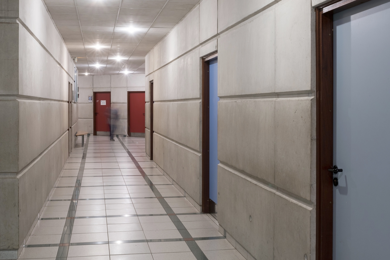 Couloir : noter la modénature du béton brut et le jeu des couleurs des portes. Philippe Brulé et Marc Quéré, architectes, 1997.Immatriculation