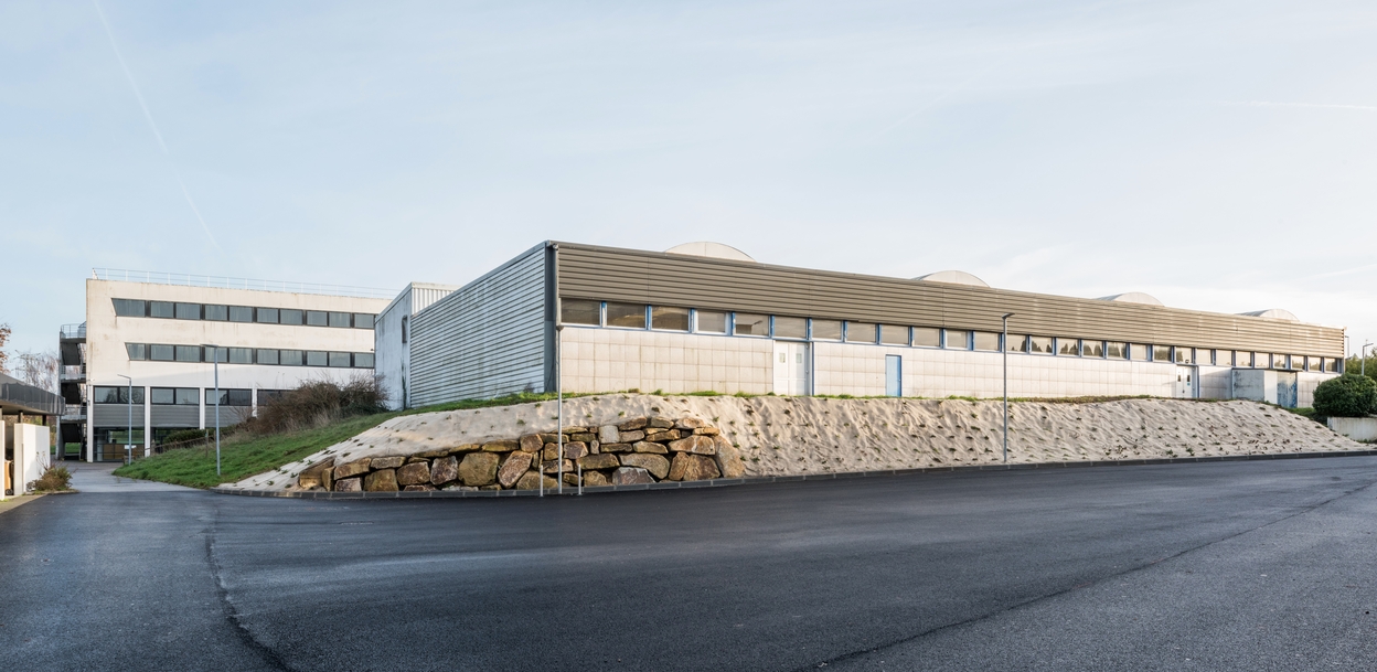 Vue d'ensemble des anciens ateliers, prise du sud-ouest. Roger Dhuit, Jean-Claude Dondel, Jean de Jaegher, architectes, 1967.Immatriculation