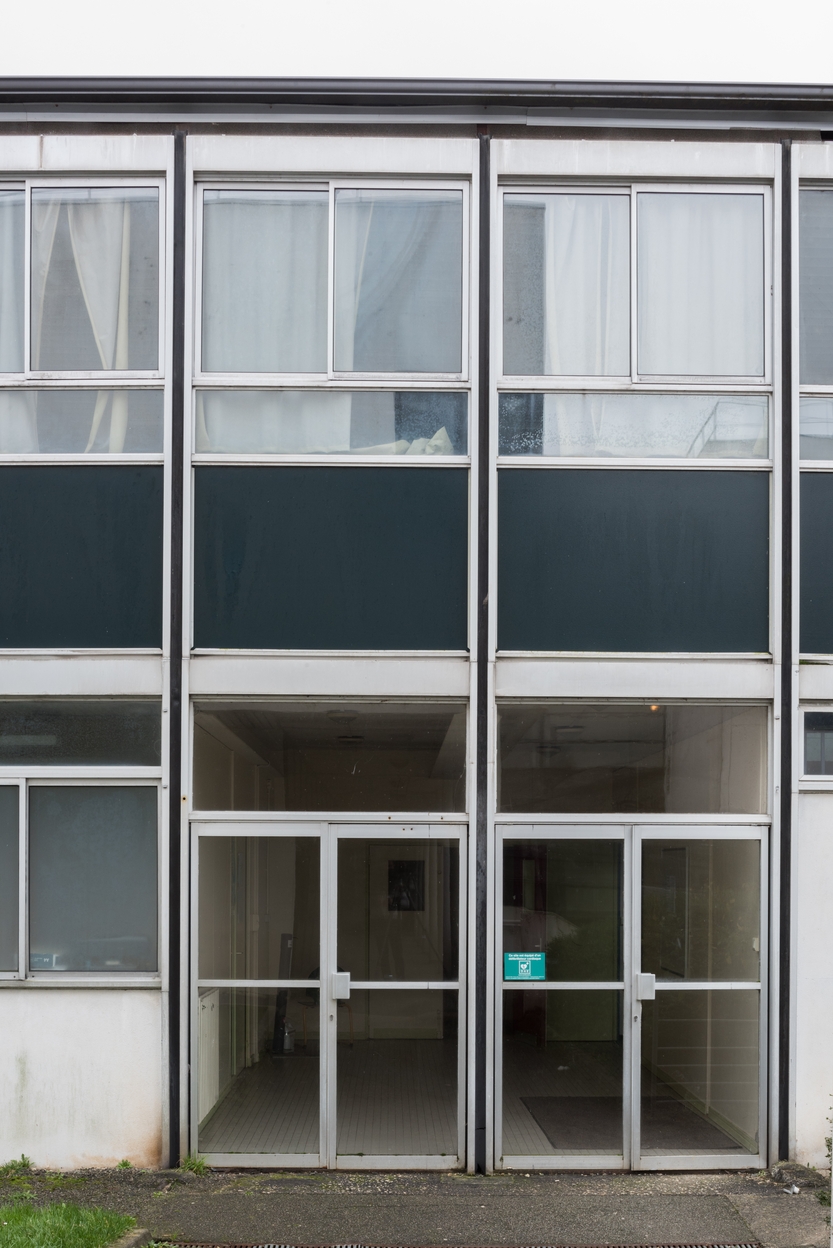 Détail de la façade à structure métallique des anciens ateliers, au niveau de l'entrée. Roger Dhuit, Jean-Claude Dondel, Jean de Jaegher, architectes, 1967.Immatriculation