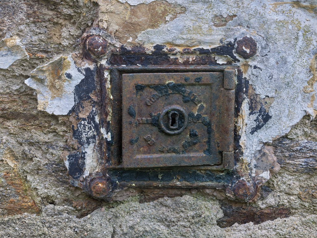 Vue de détail du mur de clôture au nord : boîte de ronde encastrée. On semble lire : CON[TROL]EUR DE RONDEImmatriculation