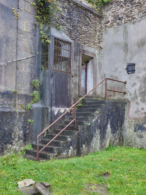 Vue de l'accès nord de la cour ouest : escalier, puis porte doublée d'un poste de surveillance. Une petite niche fermée par un volet métallique est aménagé dans l'épaisseur du mur de clôture ouestImmatriculation