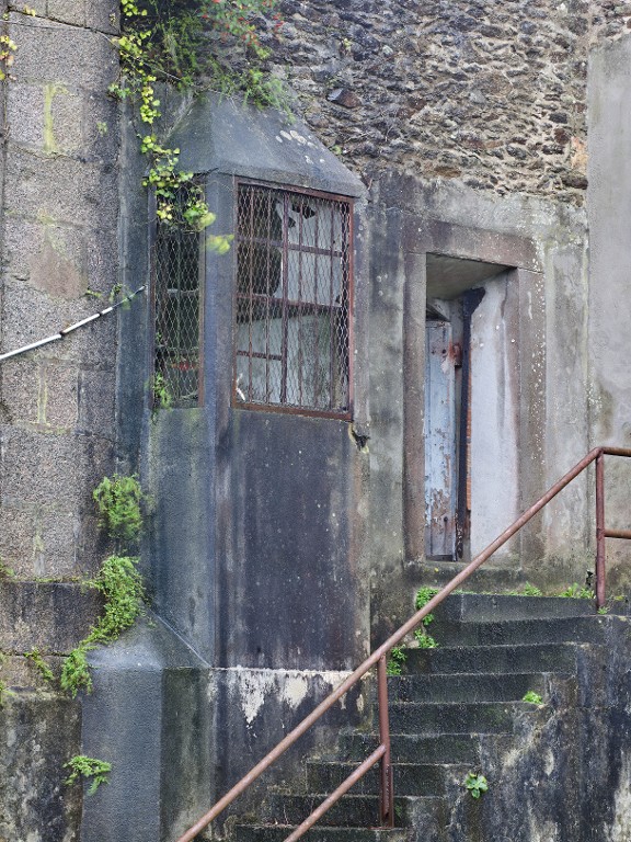 Vue de l'accès nord de la cour ouest : escalier, puis porte doublée d'un poste de surveillance. Une grille protégeait les petits carreaux du poste de surveillance de la cour nordImmatriculation