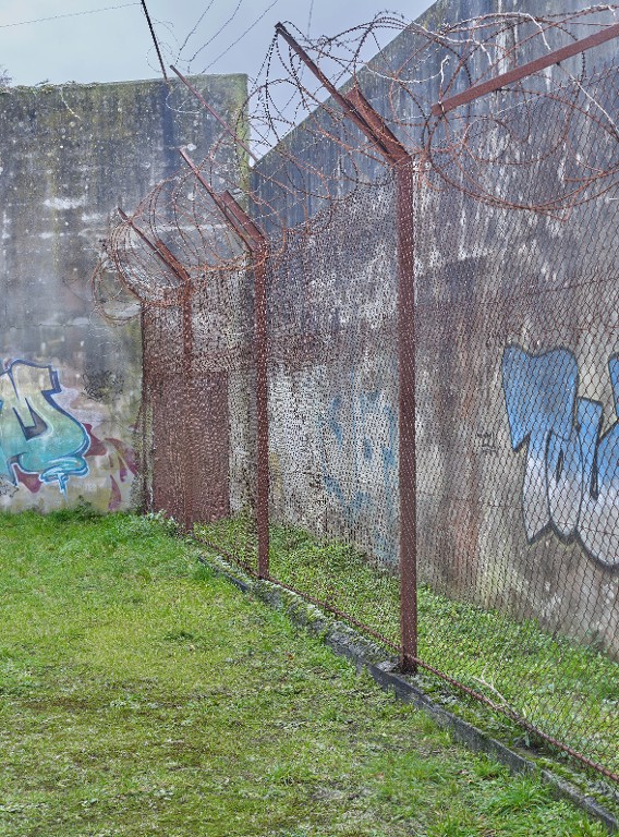 Vue du grillage surmonté de fil barbelé de la cour nord. Derrière le grillage, l'accès à l'extrémité nord du terrain de la parcelle de la prisonImmatriculation