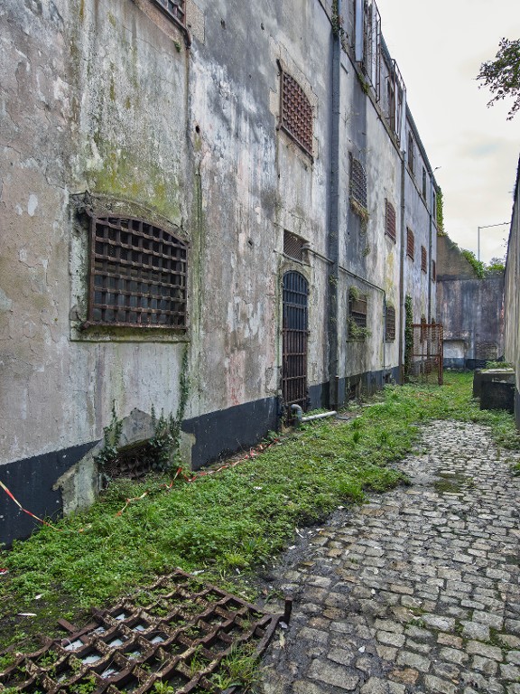 Vue générale de la cour ouest depuis le nord. Cette cour conserve son dallage d'origine. A gauche, l'élévation ouest du bâtiment carcéral avec son enduit et sa bande de propreté peinte en noirImmatriculation