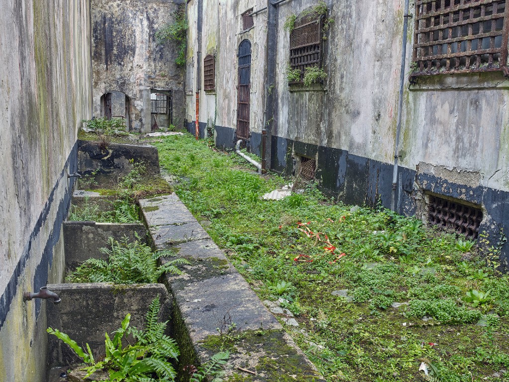 Vue du lavoir collectif accolé au mur de clôture ouest côté rue Pierre Ozanne. Des robinets sont encastrés dans le mur. Les murs conservent leurs enduits et leur bandes de propreté peintes en noirImmatriculation