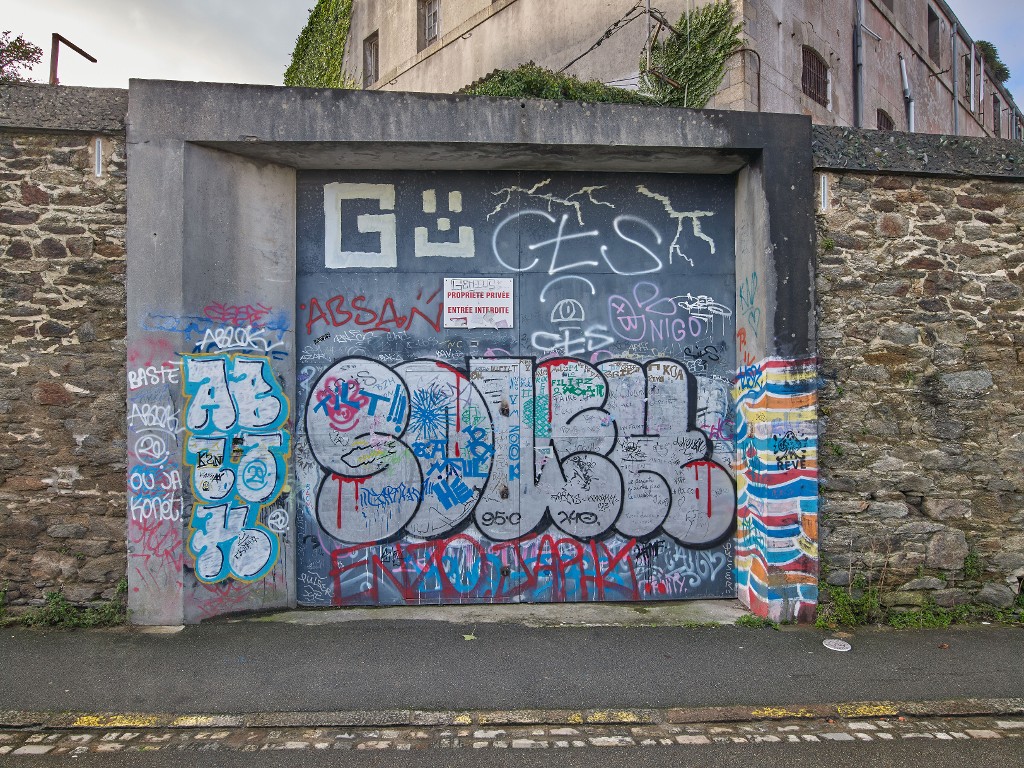 Vue de l'entrée charretière depuis la rue de Pontaniou : c'est l'entrée principale de la prison. Son piédroit ouest est oblique afin de permettre l'entrée optimale des véhicules dans la cour d'honneur. Elle est fermée par une porte métalliqueImmatriculation