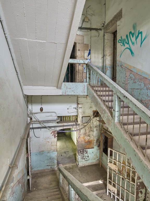 Vue de la cage d'escalier depuis le palier situé entre le rez-de-chaussée et le premier étage. L'escalier est en béton arméImmatriculation