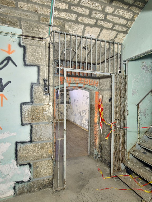 Vue de l'entrée de l'une des pièces voûtées du rez-de-chaussée (deuxième travée depuis le sud, n° 4). La porte a disparu mais une grille la remplace. A droite, escalier droit métalliqueImmatriculation