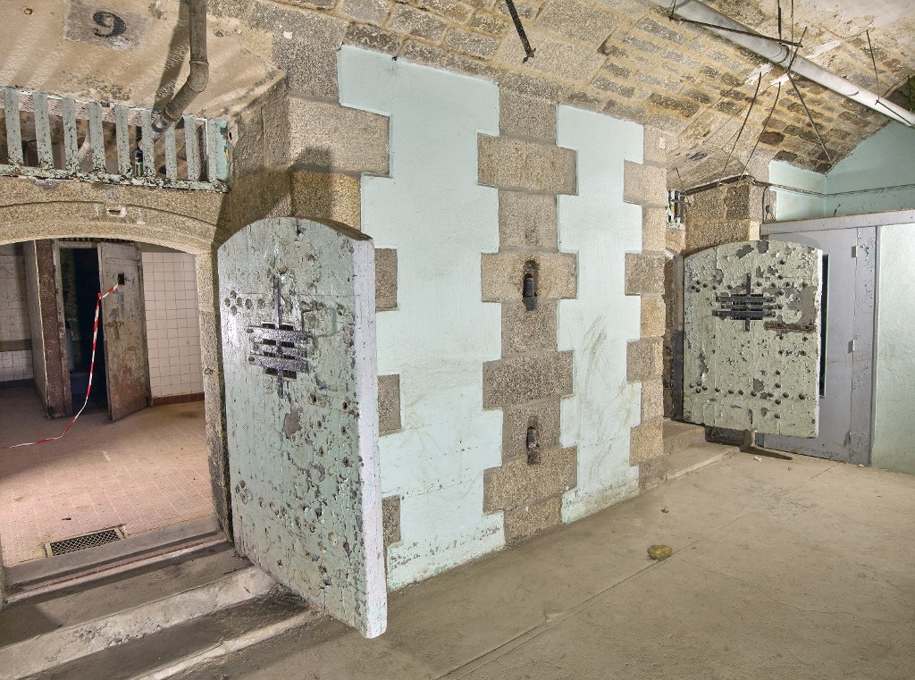 Vue des portes n° 9 et 10 depuis le couloir central. Les impostes sont dotées de barreaux verticaux. Dans le couloir, deux gonds témoignent de l'ancienne distributionImmatriculation