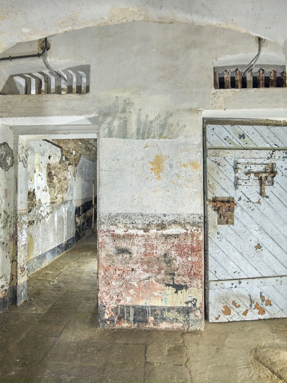 Vue de la pièce voûtée nord du rez-de-chaussée, côté ouest. Elle est divisée en deux petites cellules qui conservent : porte en bois à juda et verrou, impostes à barreaux, enduit et peinture avec traces d'un bat-flanc. Au sol, dallage en graniteImmatriculation
