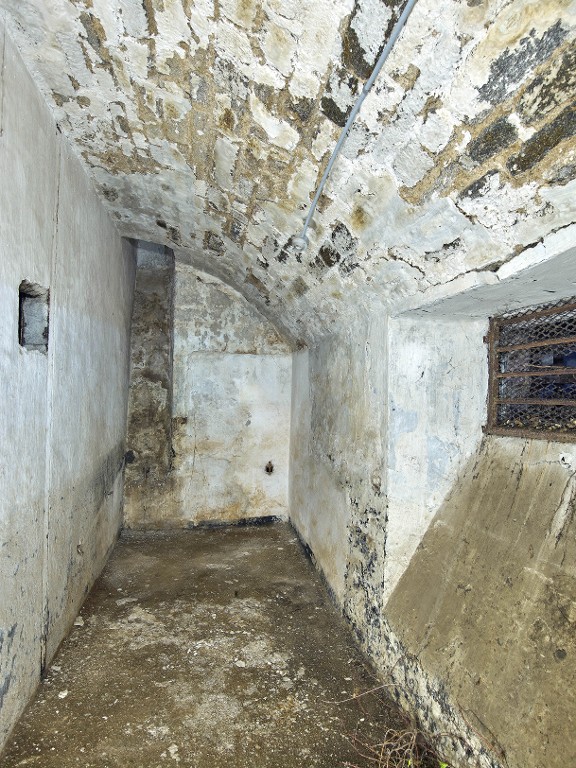 Vue de la cellule nord du rez-de-chaussée, côté ouest : elle demeure dans la pénombre. Cette cellule conserve sa porte à juda et verrou, son imposte à barreaux, son enduit et sa peintureImmatriculation