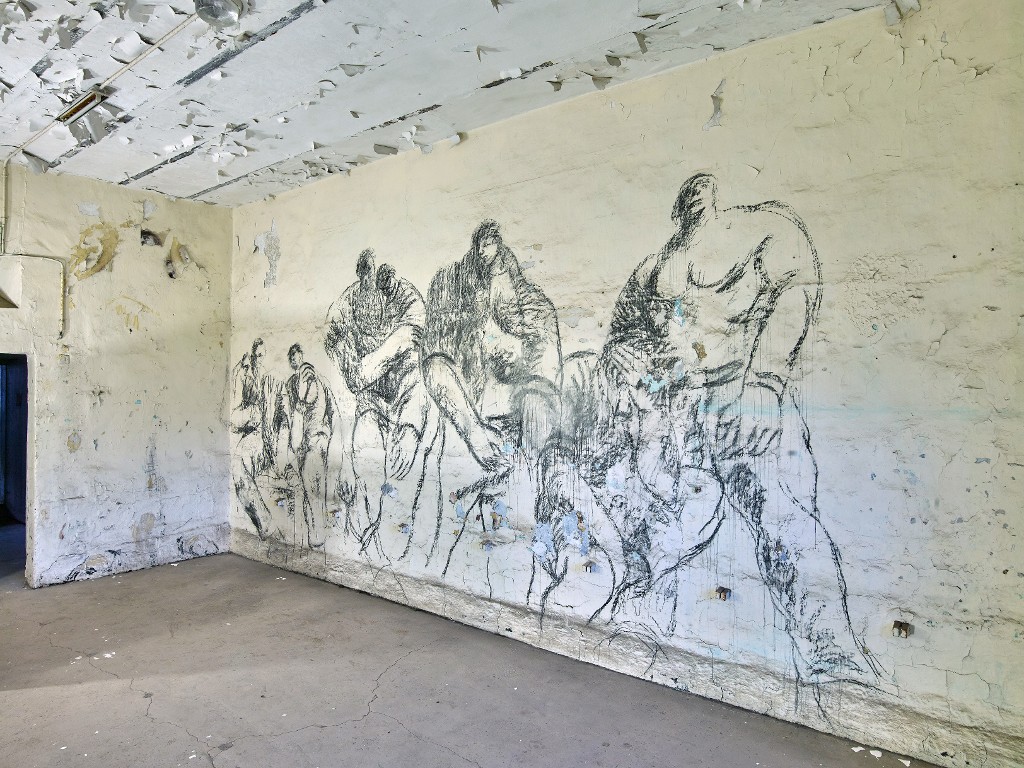 Vue de l'une des cellules du deuxième étage (plafond en voûtain de brique et poutrelles). Sur le mur de droite, une oeuvre de Paul BloasImmatriculation