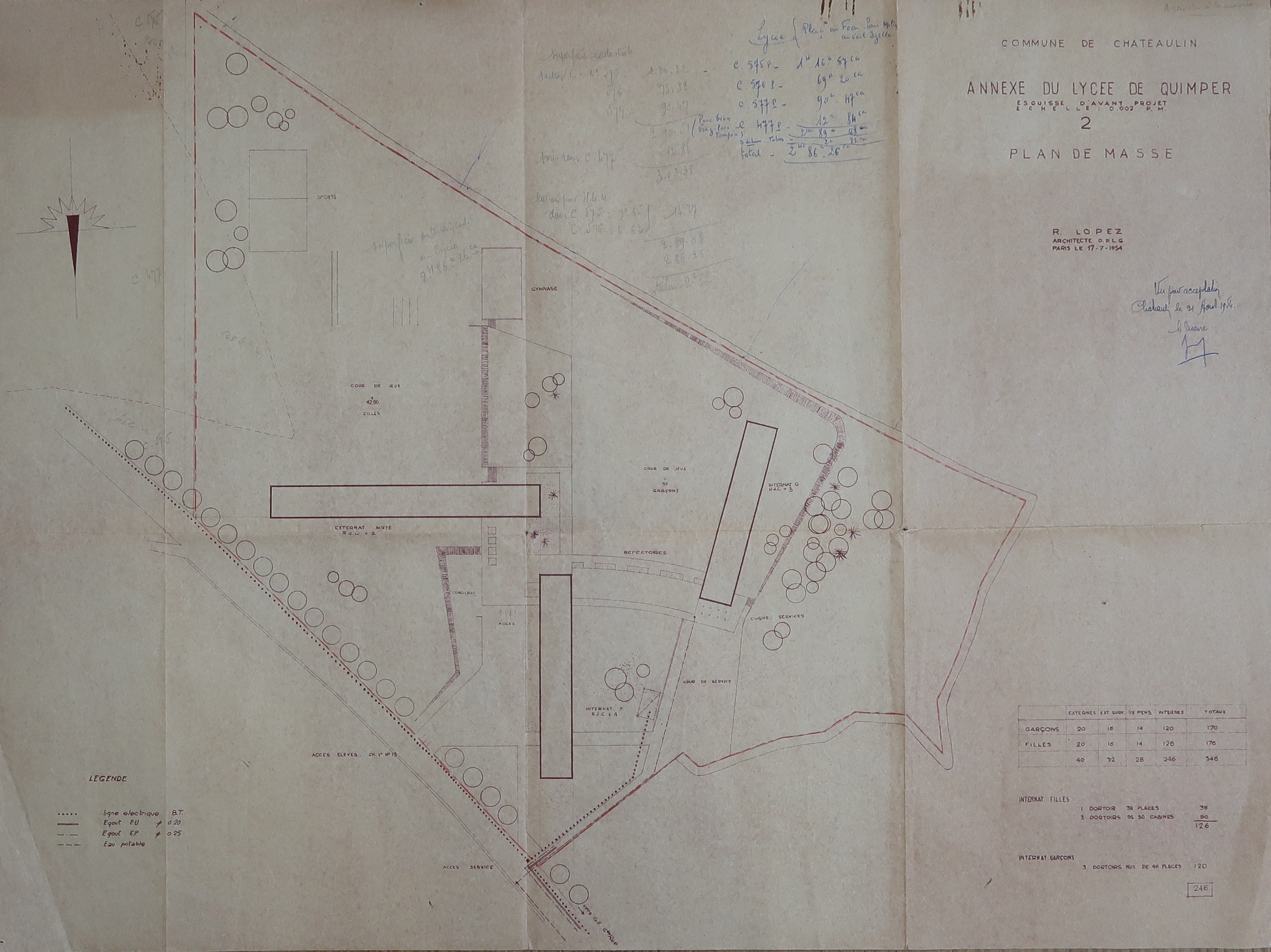 Plan de masse (et résumé du programme). Raymond Lopez, architecte, 1954.Immatriculation