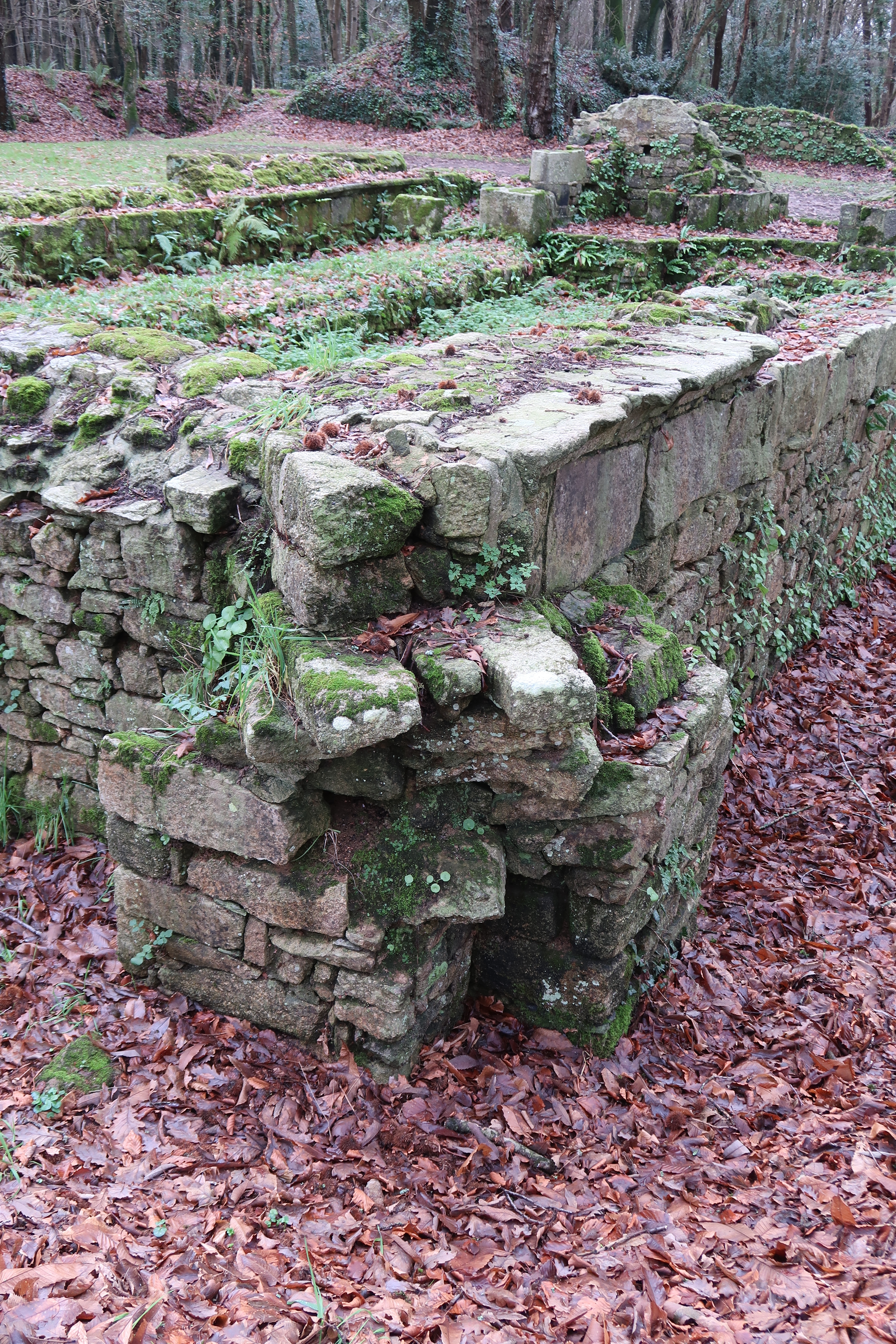 Vue du contrefort oblique situé à l'intersection des murs nord et est (chevet plat). Deux contreforts d'époques différentes sont superposés (l'un : droit ; le second : oblique)Immatriculation