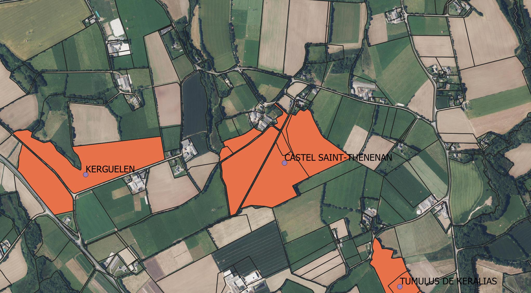 Vue aérienne verticale du site archéologique de Lesquélen (orthophotographie de 2021 avec zones de présomption archéologique issues de la carte archéologique nationale)Immatriculation