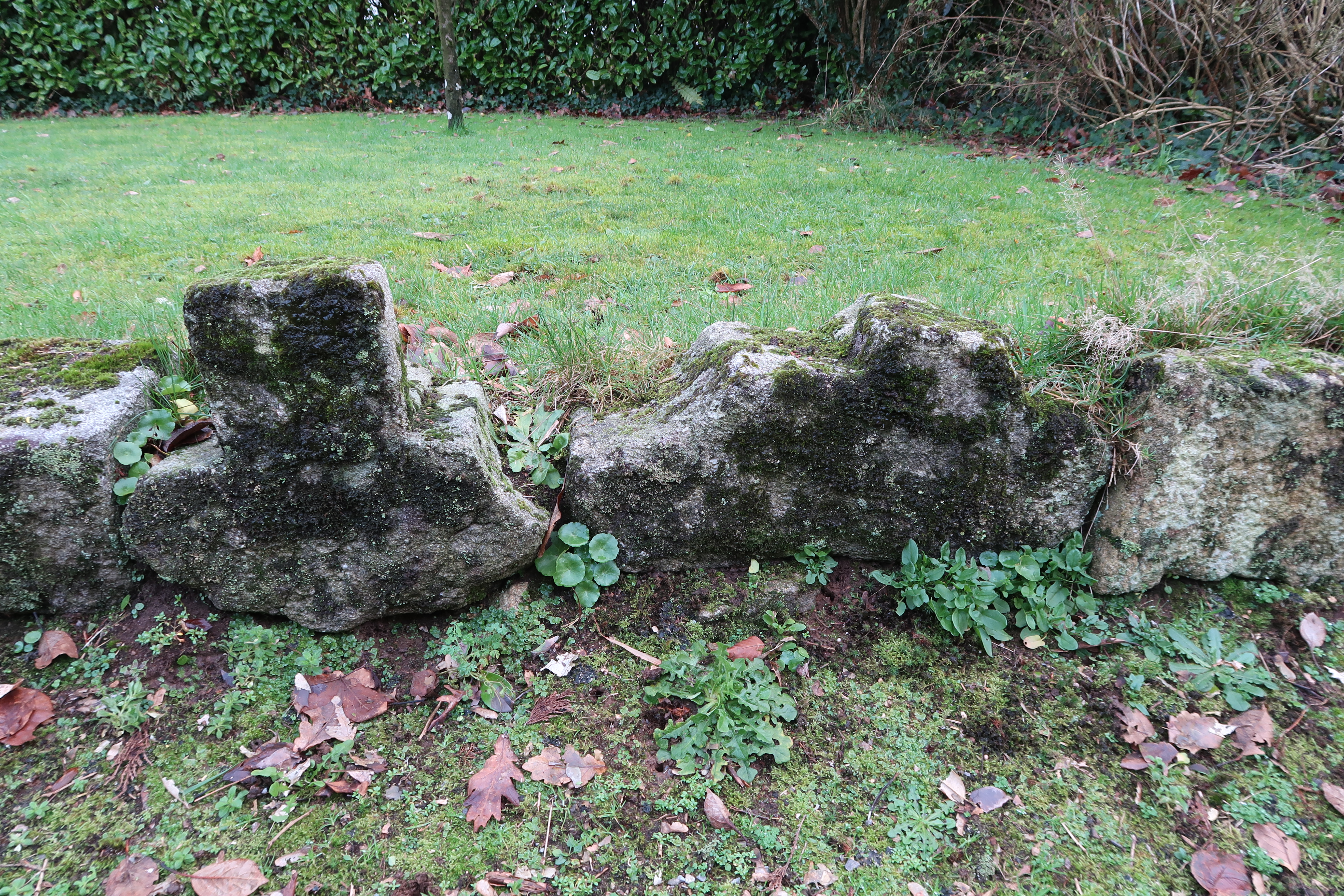 Vue du jardin de la ferme de La Salle (I), état en hiver 2023. Des pierres de taille provenant de constructions anciennes sont réemployées comme bordureImmatriculation