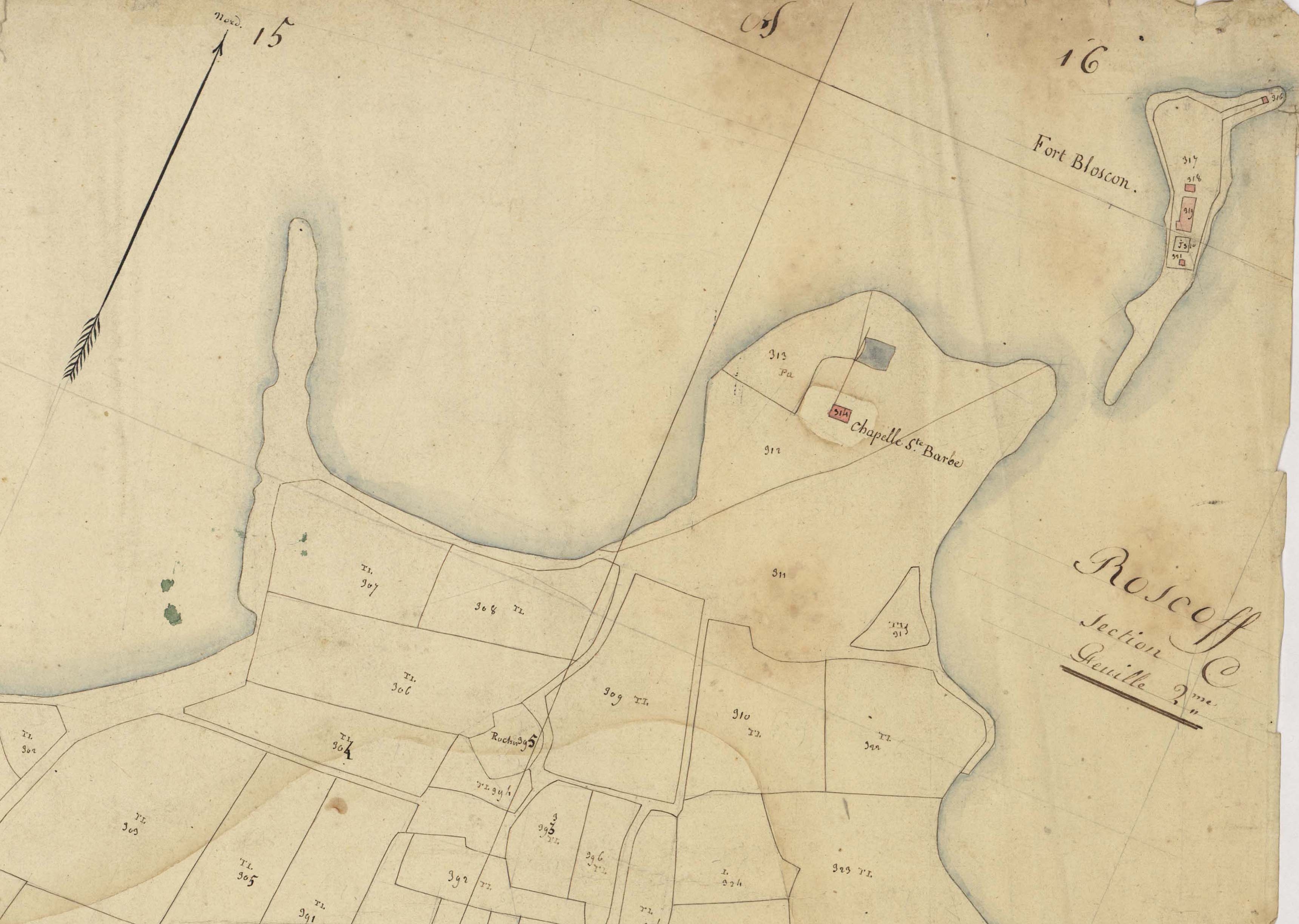 Extrait du cadastre parcellaire de Roscoff : chapelle Sainte-Barbe et fort Bloscon, 1809Immatriculation