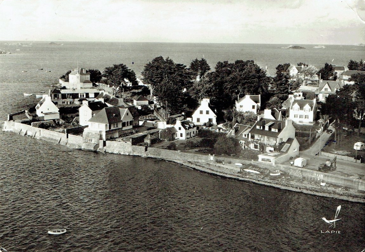 Vue aérienne oblique du Port de Carantec à basse altitude, carte postale, éditions Lapie. Le bunker - casemate est couvert par une extensionImmatriculation