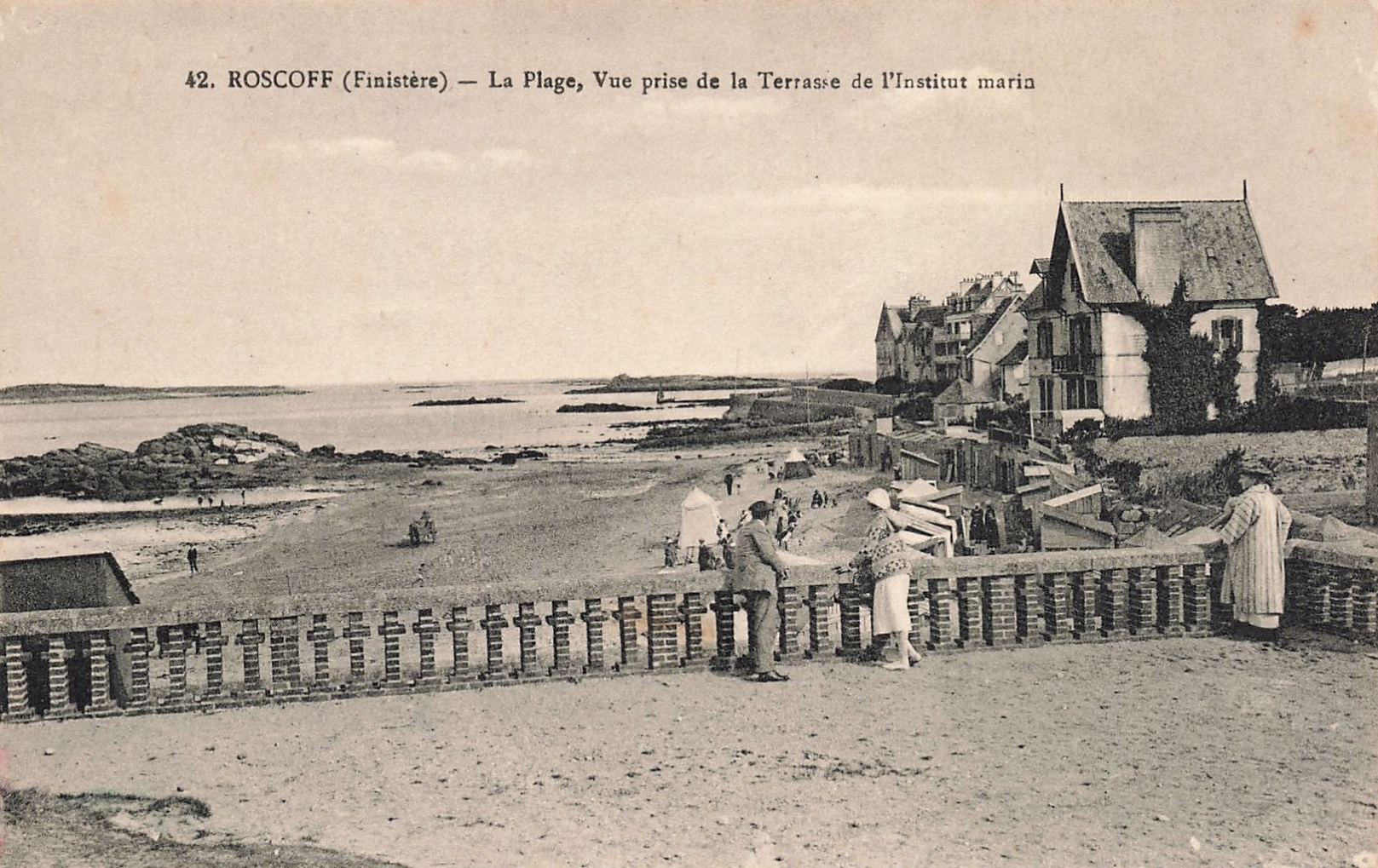 Vue de la plage de Roc'h Kroum depuis la terrasse de l'Institut marin à Roscoff, établissement de thalassothérapie, carte postaleImmatriculation